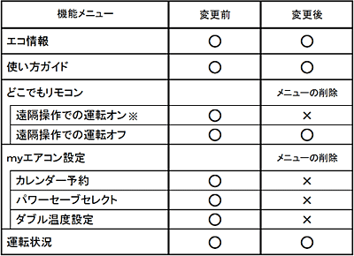 8月21日の発表当初は、専用アプリ「パナソニックスマートアプリ」を使用して外出先からの遠隔操作に対応することを想定していたが、監督官庁と協議した結果、電波を利用し、外出先などから遠隔操作で運転をオンにする機能は、電気用品安全法技術基準への適合に課題があると判断。アプリの「どこでもリモコン」機能と「myエアコン設定」機能を削除し、基準への適合を図る。