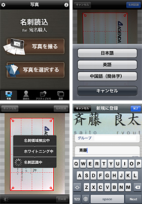 OCR機能を搭載し、iPhoneのカメラで名刺を撮影するだけで、自動的に住所や名前などの情報を読み込むアプリ。名刺の文字を手で入力する必要がなく、すばやく読込みが完了する。