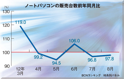 家電量販店の実売データを集計した「BCNランキング」によれば、ノートパソコンの販売台数前年同月比は、今年3月、119.0%を記録したが、これは昨年3月の東日本大震災による販売減少を受けた数値で、必ずしも実態を表してはいない。その後、4月は99.2%、5月は94.5%と昨年を下回り、6月に106.0%と持ち直したが、7月が96.8%、8月が97.8%という状況だ。