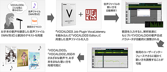 産総研が開発した人間の歌い方をまねて歌声を合成する技術「VocaListener」のライセンスを受けて、「VOCALOID3 Editor」にインストールして組み込める「VOCALIST3 Job Plugin」で一般向けサービスとして実用化した。「VOCALOID」による人間らしい自然な歌声合成が、人間の歌声を録音した音声ファイルを歌詞とともに入力するだけで簡単にできる。パートごとの処理にも対応する。