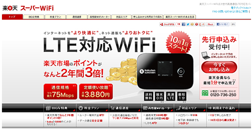 「楽天スーパーWiFi」は、次世代高速通信規格のLTE(Long Term Evolution)に対応したモバイルデータ通信サービス。イー・アクセスが提供する下り最大75Mbps、上り最大25MbpsのLTEサービス「EMOBILE LTE」を楽天ブランドで展開するもので、9月19日から、サービス紹介ページ(http://superwifi.rakuten.co.jp/)で申込みを受け付ける。