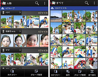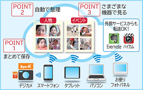 顔やシーンを識別して「年月」「人物」「イベント」「場所」「機種・サービス」ごとに自動でグループ分けするなどの整理機能を提供。Evernote、無線LAN内蔵SDメモリカード「Eye-Fi」、複数の動画や写真に特殊効果やBGMをつけてオリジナルムービーが作成できる「ハイカム」と連携し、写真・動画を一括で保存・閲覧・整理することもできる。