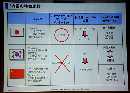 11年の調査で。日本はスマートフォンとフィーチャーフォンの2台を所有しているユーザーは43.7%。これに対して韓国・中国では、「2台持ち」はほとんど浸透していない。日本は、従来型携帯電話特有のアプリケーションなど、利活用サービスが広く普及しているが、中国と韓国では携帯電話は「ただの電話」という位置づけで、「単純にスマートフォンに乗り換えるだけ」という。