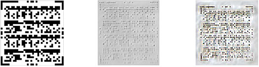 左から、記録パターン、光学顕微鏡で撮影したドット像、輪郭強調処理後のドット像
