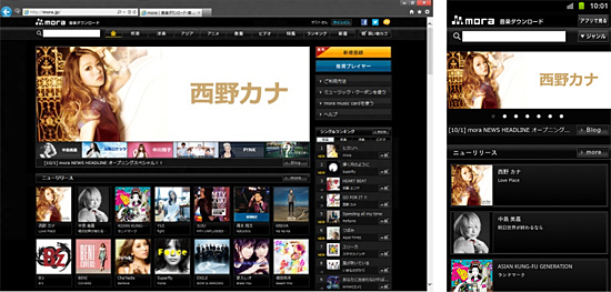 PC向けの「mora」とスマートフォン向けの「mora touch」を統合し、PC、Android搭載スマートフォン/タブレット端末で同一のサービスを提供。「mora」サイトやアプリを、それぞれの端末に最適化したデザインに一新し、端末の最新スペックに対応し、より視認性を高めた直感的なレイアウト、より効率的な導線で情報を提供する。