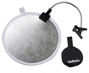 「レフ板&クリップセットII」は、携帯しやすい30cm径の丸型レフ板と専用クリップのセット。クリップ部には、自由な角度から光を当てることができるフレキシブルアームを採用する。アーム先端はレフ板をしっかりと挟み、アーム根元は三脚のパイプをしっかりホールドできる。ミニ三脚と組み合わせれば、携帯用のマクロ撮影専用機材として使うことができる。