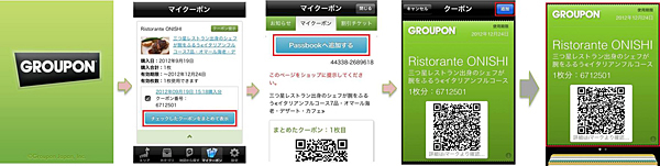 スマートフォンサイトまたはアプリケーションからグルーポンを立ち上げ、グルーポンの「マイクーポン」ページから、発行するクーポンを選択。「Passbookへ追加する」ボタンを押すと、「Passbook」用のクーポンを表示する。「追加」ボタンを押すと、「Passbook」にクーポンが追加される。