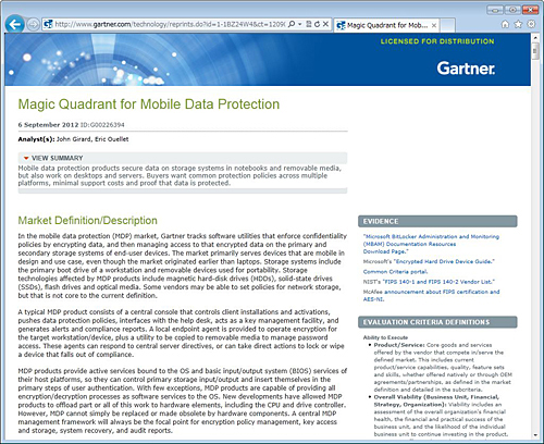 「Magic Quadrant for Mobile Data Protection」調査では、エンドユーザーのモバイルデバイスのデータを、暗号化や認証によって保護するモバイルデータ保護製品を提供しているベンダーを評価している。