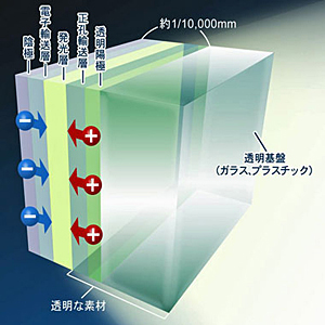 有機ELは、電圧をかけると発光する有機化合物を2枚のガラス板の間に挟み、電圧をかけて光らせる。発光効率が高く省電力で光るうえ、薄く、コンパクト。有機化合物を挟む板をプラスチックなどの柔らかい素材にすることで、折り曲げることができるという特徴をもつ。さらに、点で光る白熱電球やLED電球と異なり、面で発光するので、広い範囲を照らすことができる。