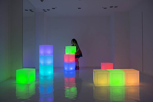 さらに、「あかり」「ひかり」の重要性を、空間デザインやロボット開発を手がける二人ならではの視点で語り合う。チームラボは、ブロック型の照明器具「メディアブロックチェア」が9月13日に経済産業省主催の新事業「Innovative Technologies」に採択された。単体でも照明器具やイスとして使えるほか、ブロックの凸の面と凹の面とをジョイントすることで光の色を変えることができる照明器具だ。猪子社長は「いろいろな作品を手がけているが、アウトプットが映像だったり、あかりだったりする作品が多い」と自分の作品を振り返る。