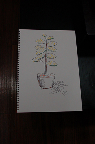 高橋社長が、スケッチブックにササッと観葉植物らしい絵を描く。「面で光る特徴を生かして、観葉植物の葉っぱが光ったらいいな、と。照明だけでなく、インテリアにもなりますよね」。