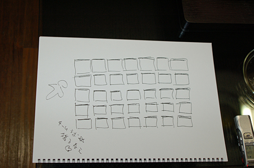 猪子社長は、有機EL照明パネルらしいマスをいくつも描き連ね、「パネルを格子状に並べて、外とかに置くんです。で、風が吹くと軽いパネルがパタパタ動いて、動いているパネルだけが光るとか……」と話すと、それを見た高橋社長も「ああ、いいですね。パネルの中心を止めて、クルクル回してもおもしろいですよ」と、斬新なアイデアを出し合った。
