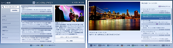 「レグザ」の「タイムマシン」機能で一時保存した番組や通常録画した番組から、シーンタイムで見たいものを探す「みどころシーン再生」サービスを用意。キーワード検索によるシーンの能動的な検索をはじめ、「検索急上昇ワード powered by Yahoo! 検索」などのおすすめシーンの視聴にも対応する。ピックアップされたシーン一覧から見たいシーンを選ぶだけで、指定したシーンをダイレクトに再生する。