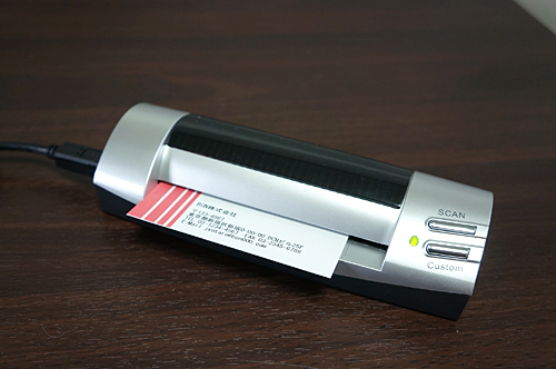 では、さっそく名刺を付属の高速カラースキャナで取り込もう。まずは、ソフトウェアのインストールと、スキャナのセットアップ。名刺をスキャナにセットして「Scan」ボタンを押すと、自動で名刺を吸い込んで、画像として取り込む。続けて名刺を流し込めば、連続取り込みもできる。