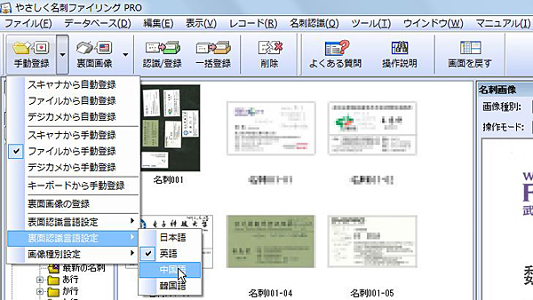 「やさしく名刺ファイリングPRO v.12.0」は、日本語・英語・中国語以外に、新たに韓国語の文字認識に対応した。中国・韓国語を認識するには、事前にツールバーの「表面認識言語設定」から中国語、韓国語を選択し、文字認識を実行する。実際に数枚の中国語名刺を取り込んだところ、認識率は日本語の名刺に及ばないものの、シンプルなレイアウトの名刺なら問題なく認識できた。