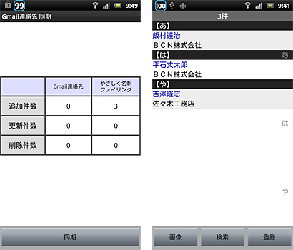 Gmailの「連絡先」と同期した名刺データは、スマートフォンとも連携する。「やさしく名刺ファイリングPRO v.12.0」には、Android/iOS用のアプリ「やさしく名刺ファイリングMoblie LE」のフル機能が利用できるライセンスが付属しているので、自宅やオフィスで名刺を取り込んで「Gmail連絡先」と同期しておけば、外出先でも、その名刺データを参照できる。もちろん、登録データからすばやく電話をかけたり、住所データから地図を表示したりもできる。