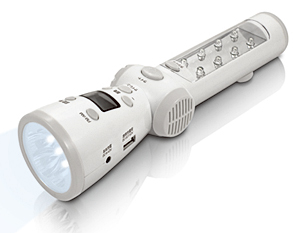 ラジオの緊急警報放送/緊急地震速報と連動し、放送信号を受信するとラジオを自動で起動して知らせる充電式のFM/AMラジオライト。ラジオは主電源を切っていても常に受信する。受信と同時にLEDライトも自動点灯するので、夜間や就寝時の警戒受信用として役立つ。
