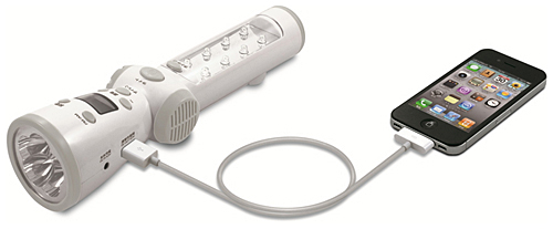 電源は1000mAhの内蔵リチウムイオン充電池で、ACアダプタ充電と手回し充電に対応。USB充電出力端子を備え、携帯電話やスマートフォンを接続することで、これらの機器の充電ができる。