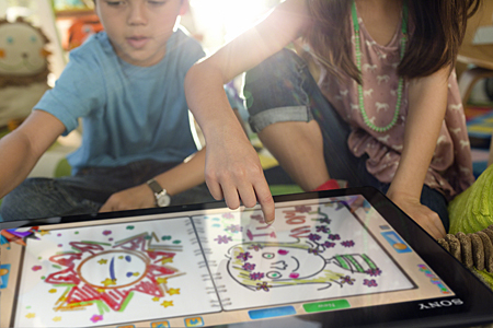 「VAIO Tap 20」は、使い方に合わせて画面の角度を自由に変えられるフリースタイルスタンドをもつ一体型デスクトップPC。10点までのマルチタッチに対応する解像度1600×900ドットの20型ワイド液晶や、内蔵バッテリを搭載。テーブルと画面を水平にした「テーブルトップスタイル」では、画面を家族で囲んで使用できる。左右から同時にお絵描きできる「Family Paint」、ビデオメッセージやボイスメッセージなどを登録できる伝言板「Fingertapps Organizer」など、家族向けの独自アプリケーションも用意する。