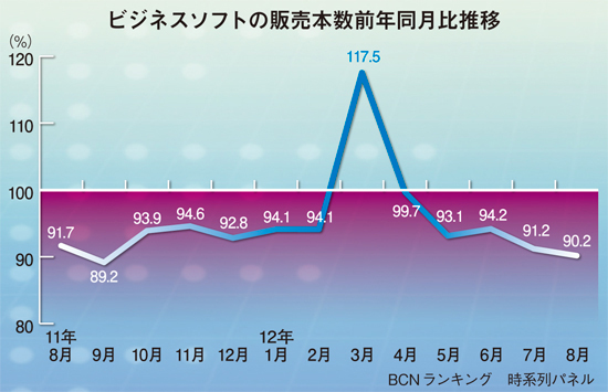 家電量販店の実売データを集計した「BCNランキング」で、2007年1月を1としたビジネスソフトの販売本数指数をみると、08年1月が0.83、09年1月が0.74、10年1月が0.72、11年1月が0.70、12年1月が0.66と減り続け、5年間で3割以上減少している。また、この1年間の販売本数前年同月比も、東日本大震災の影響で昨年大幅に減少した月(3月)を除けば、軒並み10%前後の減少で推移している。