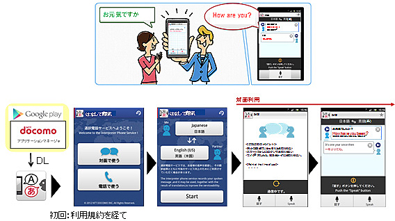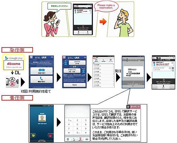 専用のアプリをインストールしたドコモのスマートフォンやタブレット端末での通話を、英語・中国語・韓国語の3か国語に通訳。発信側は、Android 2.2以上搭載のドコモのスマートフォンとタブレット端末が必要だが、着信側は他のキャリアの携帯電話や固定電話でも使用できる。