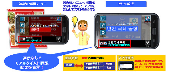 このほか、専用アプリをインストールしたスマートフォンやタブレット端末のカメラ越しに、外国語(英語・中国語・韓国語)の読めない単語や、辞書検索で入力ができない文字を表示するだけで、その日本語訳を画面にすばやく表示するサービス「うつして翻訳」を10月11日に提供を開始する。日本語の料理メニューや看板を英語・中国語・韓国語に翻訳することもできる。