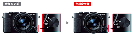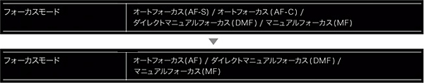 フォーカスモードを、発表時の4種類から、オートフォーカス(AF)/ダイレクトマニュアルフォーカス(DMF)/マニュアルフォーカス(MF)の3種類に変更。静止画撮影時のオートフォーカス(AF-C)は非対応となり、静止画撮影時は、オートフォーカス(AF-S)として動作、動画撮影時にはオートフォーカス(AF-C)として動作する。フォーカスモードダイヤルの仕様と外観も変更になる。