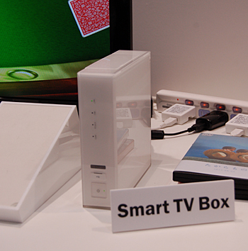 「Smart TV Box」は、Android 4.0を搭載。無線LANのアクセスポイントの機能で、スマートフォン、タブレット端末と連携する。HDDは内蔵せず、USBで外付けHDDを接続して番組を録画することができる。トリプルチューナーを搭載し、録画しながら別のテレビ番組を視聴したり、タブレット端末やスマートフォンで映像を楽しんだりできる。