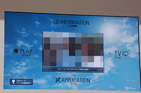 ホーム画面は、「テレビエリア」「インフォメーションエリア」「PLAYエリア」「アプリエリア」の四つに分かれ、「テレビエリア」では、地上/BS/CSの番組表を表示し、番組検索ができる。「インフォメーションエリア」では、天気やニュースなどの情報や、見逃したニュースをチェックできる。