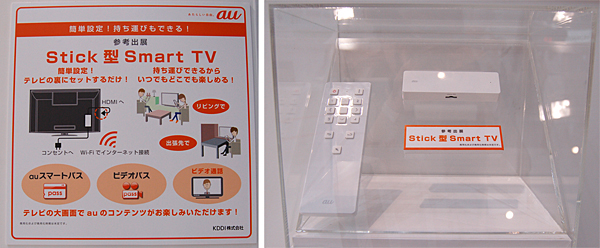 このほか、テレビと本体をHDMIケーブルで接続し、Wi-Fi経由でネット接続してauスマートパス、ビデオパス、ビデオ通話などのコンテンツをテレビで楽しめる「Stick型 Smart TV」も参考出品。auショップや量販店などで販売する予定で、より手軽にテレビをスマートテレビにすることができる。
