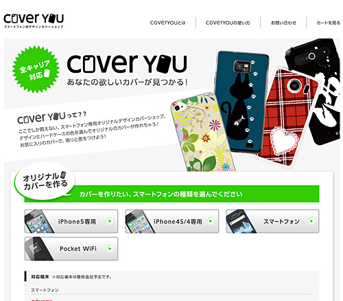 「cover you」は、今年の8月に始まったばかりのスマートフォンケースのオーダーメイドサービスだ。NTTドコモ、au、ソフトバンクモバイルだけではなく、ウィルコム、イー・モバイルと全キャリアに対応する。