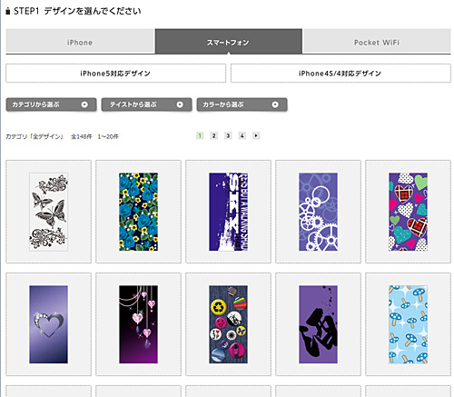 スマートフォンの種類を選ぶと、デザインの一覧が表示される。デザインは新着順に並んでいるが、ハート、チェックなどの「カテゴリ」、ポップ、キュートなどの「テイスト」、10色の「カラー」から絞り込むことができるので、イメージするデザインを選びやすい。また、デザインが豊富なことも特徴の一つだ。9月中旬時点で「iPhone 4S/4」は約300種類、「スマートフォン」と「Pocket WiFi」は約150種類ずつ、最新の「iPhone 5」も約130種類のデザインを揃えている。デザインは毎月追加しているほか、今後はデザインコラボレーションモデルを追加する予定だ。