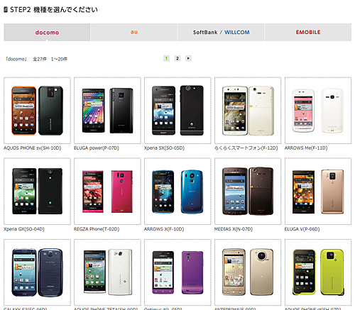 次に、端末を選択する。端末はキャリア別に並んでいるので、まずは使っているキャリアから選んでいこう。対応端末は、NTTドコモが27機種、auが11機種、ソフトバンクが7機種、イー・モバイルが1機種の計46機種だ。最新の端末、人気の端末だけではなく、ここ1~2年以内に発売した多くの端末に対応している。また、今後発売する端末についてはほぼすべてに対応する予定だ。