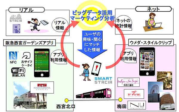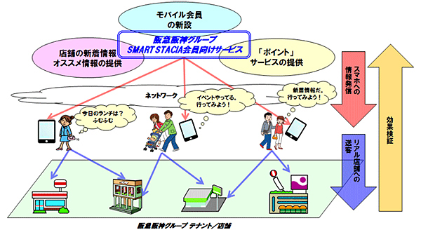 同時に、阪急阪神グループ各社、NTTグループ各社と博報堂は、阪神間の中核拠点である梅田(大阪府)・西宮(兵庫県)の主要商業施設で、「SMART STACIA」会員対象のO2Oマーケティングに関する共同トライアルを実施する。期間は2013年5月10日まで。