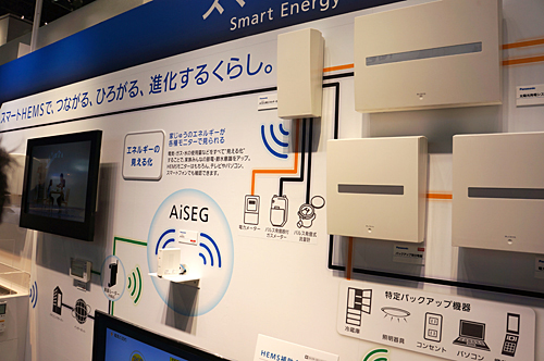 10月21日に発売する「AiSEG(アイセグ)」を中心としたエネルギーマネジメントシステムを、広いスペースを取って展示。「AiSEG」は家庭の電気設備や家電とつなげて、使用エネルギー量がわかるようにするとともに、各機器を自動制御するシステムだ。