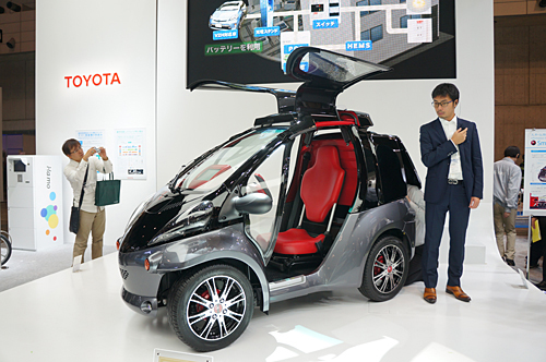 トヨタ自動車は、ガルウイングドアがまぶしいコンセプトカー「Smart INSECT」を展示。乗り込むと、顔認識機能でドライバーを自動認識する。クラウドを利用した「トヨタスマートセンター」で音声認識を行うバーチャルエージェントがドライブをサポートする。隣には、超小型電気自動車(EV)「コムス」も展示している。