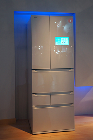 東芝は、ホームITシステム「フェミニティ」を介して、さまざまな家電製品が連携する仕組みを提案している。ステージには大型の液晶ディスプレイを搭載した冷蔵庫を展示し、冷蔵庫と音声で会話しながら調理する機能や、家族の健康管理、防犯などの機能をデモンストレーションを交えて紹介している。