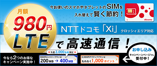 NTTドコモのLTE網を利用したデータ通信用のSIMカード。毎月200MB分の高速通信が利用できる「980円エントリープラン」と、連続する3日間で最大192MB(月間約1.9GB)分の高速通信が利用できる「2980円アクティブプラン」がある。両プランとも、標準SIMとマイクロSIMが選択できる。