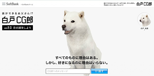 「白戸CG郎」の音声が、エーアイのオリジナル音声辞書作成サービス「AITalk Custom Voice」を採用。閲覧者が入力したテキストと、「白戸CG郎」の音声で会話ができる「話ができるお父さん!? 白戸CG郎」がソフトバンクモバイルのホームページに9月14日に登場した。ホームページで「白戸CG郎」が問いかける質問に対し、閲覧者がメッセージをテキストで入力して「話す」ボタンをクリックすると、入力した内容に合った回答が白戸CG郎の音声で返ってくる。