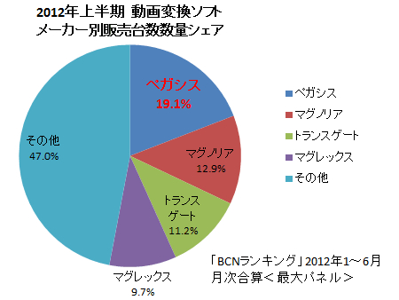 とはいえ、PCソフトはパッと見るとどれも同じように見えて、何を選んでいいいか悩む人も多いだろう。そこでオススメなのが、ペガシスの動画変換ソフト「TMPGEnc Video Mastering Works 5」だ。ペガシスは、「BCNランキング」の2012年上半期(1~6月)の動画変換ソフトで19.1%の販売本数シェアを獲得し、1位に輝いた実績のあるメーカーだ。