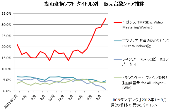 ペガシスを動画変換ソフト市場で1位のメーカーに押し上げているのが、2011年2月発売の「TMPGEnc Video Mastering Works 5」だ。発売直後からずっと1位を走り続け、直近の9月の月次では32.6%の圧倒的なシェアを占めている。