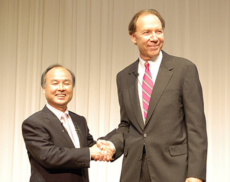 がっちりと握手する孫正義社長とスプリント・ネクステルのダン・ヘッセCEO
