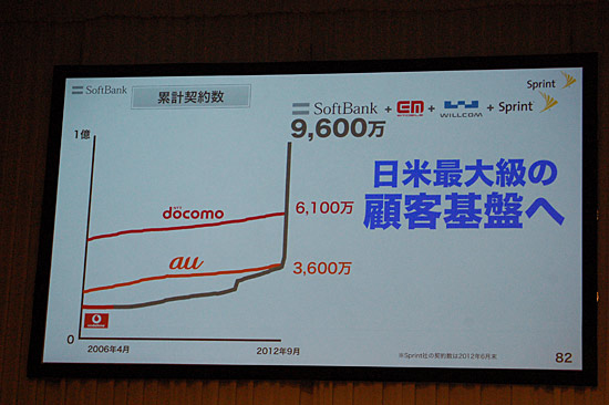 最後に孫社長は、NTTドコモ、KDDI(au)を累計契約者数で大きく引き離すことについて、「男子たるものいずれは1位を、と志し、いつかはドコモを抜くと思っていた。次は世界1位を目指す志はあるが、まずはスプリントと経営統合して、しっかりとやり遂げることに専念したい」とコメントした。