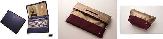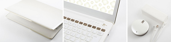 天板は、上品でエレガントなグラデーション仕上げで、ディスプレイ開口部は爪が長くても開けやすいクラッチバッグ形状。電源ボタンはパール調に、ステータスLEDとCaps Lockキーにはダイヤモンドカットストーンを配し、上品さを演出した。キーボードには透明感をもたせ、一つひとつのキーを繊細なゴールドリングで囲むんだほか、空気口は、すべて花柄モチーフのデザインを採用した。また、付属品のACアダプタとワイヤレスマウスは、女性の手に馴染むコンパクトなサイズで、アクセントとしてジルコニアを散りばめるなど、細部までエレガントさにこだわった。