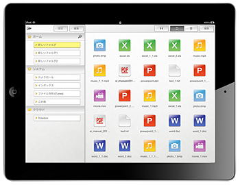 対応拡張子は、doc/docx/xls/xlsx/ppt/pptx/pdf/txt/jpg/png/bmp/gif/mp4/mov/mp3。対応機種は、新iPad(2012)/iPad 2/iPad。対応OSは、iOS 5.1以上。