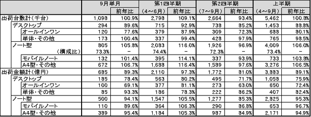 2012年9月、2012年度第2四半期、上半期の国内PC出荷実績
