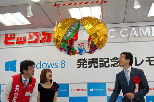 午前9時30分前にはビックカメラの宮嶋社長、日本マイクロソフトの樋口社長、小林さんがカウントダウンとともにくす玉を割り、「Windows 8」の販売開始を祝った。