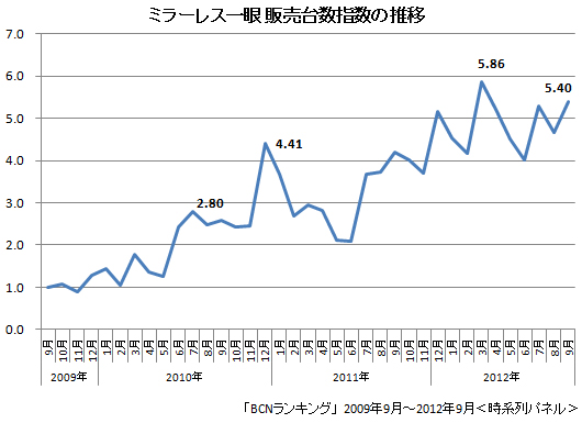 直近の2012年9月のミラーレス一眼カメラの平均単価は5万円台前半。扱いやすそうな小型・軽量ボディや多彩なカラーバリエーション、売り場の拡大、商品ジャンルの浸透などに加え、手頃な価格も人気の理由だろう。