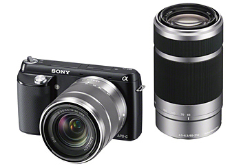 「EOS M」同様、APS-Cサイズのイメージセンサを搭載したソニーの「NEX-F3」。カラーはブラック、ホワイト、ピンクの3色(写真はブラック・ダブルズームキット)