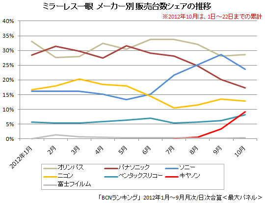 量販店の実売データを集計した「BCNランキング」によると、2012年1月から9月までに、ミラーレスタイプのレンズ交換式デジタルカメラを発売したメーカーは8社。メーカー別販売台数シェアは、オリンパス(30.9%)、パナソニック(27.7%)、ソニー(18.8%)、ニコン(15.7%)の順で、上位3社がシェア20%台後半~30%台後半で競っていた昨年までの“3強状態”は崩れつつある。2012年10月は、22日までの途中集計で、オリンパス(28.6%)、ソニー(23.5%)、パナソニック(17.3%)、ニコン(12.8%)に続き、「EOS M」のダブルレンズキットを9月29日に、ボディ単体・レンズキットを10月12日に発売したキヤノンがシェア9.2%で5位に食い込んでいる。